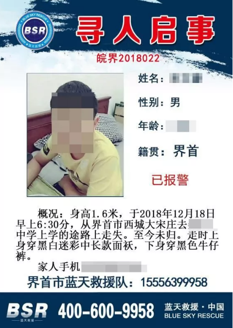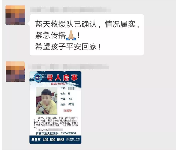 12月18日晚23时许,界首市新华派出所接到辖区居民报警,其14岁的儿子失联了。经了解,上周其儿子因学习成绩退步被其责骂。18日早上宋某正常离家去上学,可到晚上并没有回家。其家人与班主任联系,班主任称宋某当天并没有去上学。家人回想起之前收到宋某发送的一条短信称“我的世界清净了”,顿时慌了神。宋某家人寻找无果后急忙跑至新华派出所报警,并向蓝天救援队寻求帮助。