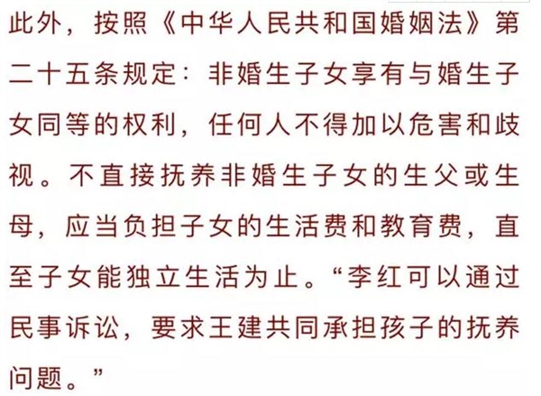 “民事诉讼中,李红可以举证是男方主张的‘借种生子’,从而可以要求多分割部分夫妻共同财产。”徐付忠表示,一般来说,李红婚外与王建生育一女,属于非婚生子女。王明没有和李红共同抚养子女的义务,非婚生女儿应有李红抚养,且不得要求王明支付女儿的抚养费用。