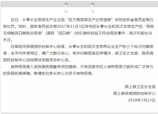 阜阳市颍上县卫生和计划生育委员会关于近期问题疫苗我县使用情况的公告