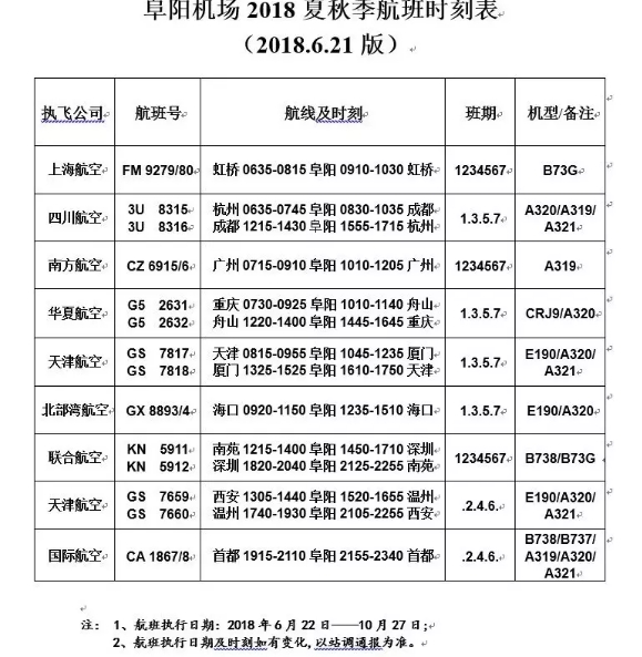 从阜阳民航局了解到:注意:1、航班执行日期:2018年6月22日-10月27日2、航班执行日期及时刻如有变化,以站调通报为准。从时刻表来看,目前阜阳机场航班可直航北京、天津、厦门、上海、杭州、成都、重